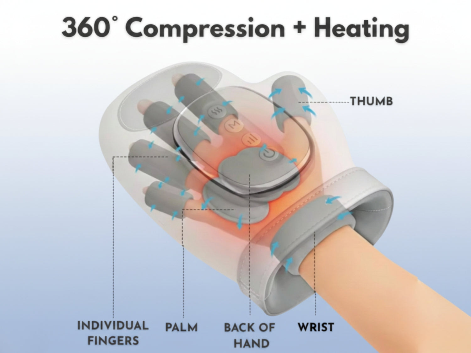 - 360° ergonomic coverage ensures every area — palms, fingers, and wrists — receives soothing, even relief.